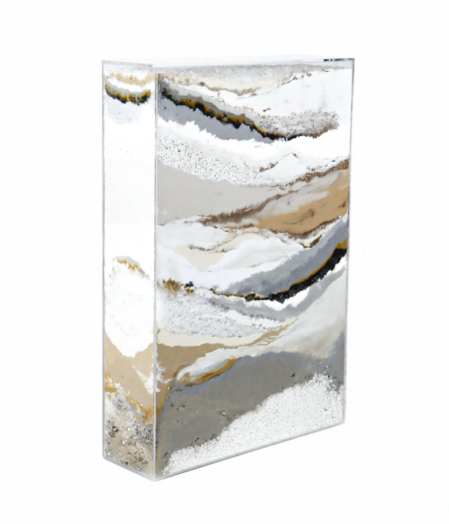 Carbón, ceniza, arenas, sales, sulfatos y semillas, caja acrílica